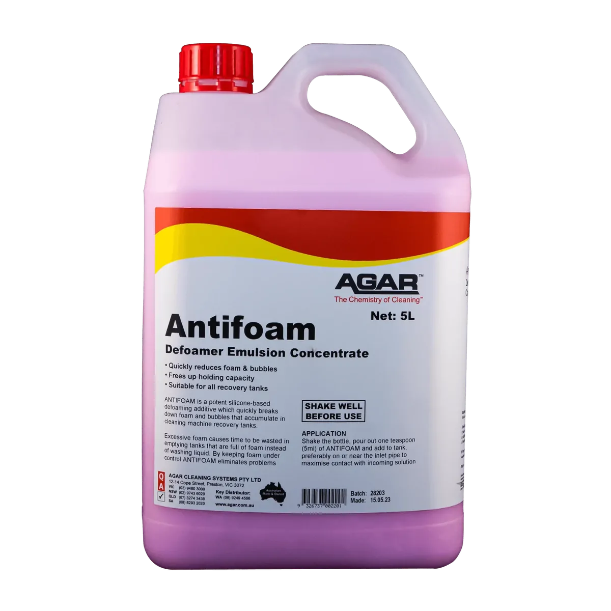 ANTIFOAM is a potent silicone-based defoaming additive which quickly breaks down foam and bubbles that accumulate in cleaning machine recovery tanks. Excessive foam causes time to be wasted in emptying tanks that are full of foam instead of washing liquid. By keeping foam under control, ANTIFOAM eliminates these problems.